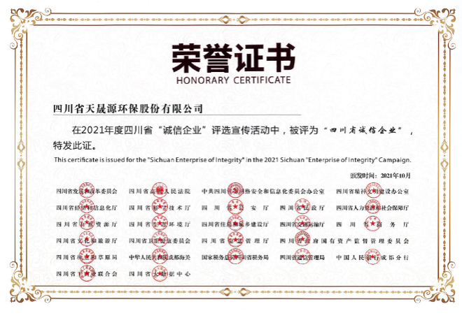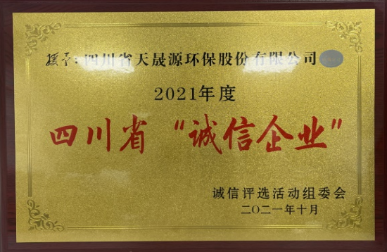 在以公司總經理張恒同志為首的公司經營管理團隊帶領下,天晟源環保自成立以來,堅持以人為本,著力構建和諧勞動關系,公司經濟效益和社會效益得到了全面發展,公司先后獲得成都市“守合同重信用”企業稱號、中國環境保護產業協會企業信用評價AAA等級、國家稅務總局四川省電子稅務局納稅信用狀態評價A級等眾多誠信榮譽,具有極高的社會信譽認可度及行業誠信贊譽度。
