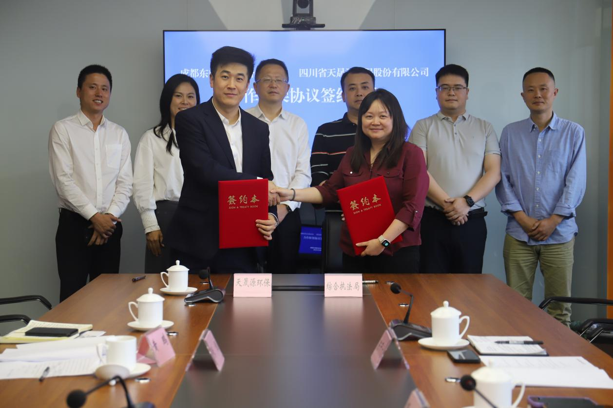 2024年4月23日,成都東部新區綜合執法局與四川省天晟源環保股份有限公司(簡稱天晟源環保)在東部新區舉行合作框架協議簽訂儀式,成都東部新區綜合執法局副局長楊濤、生態環境處負責人韓周承,天晟源環保黨支部書記、董事長李大有,黨支部副書記、總經理張恒,副總經理李美玲等出席儀式。