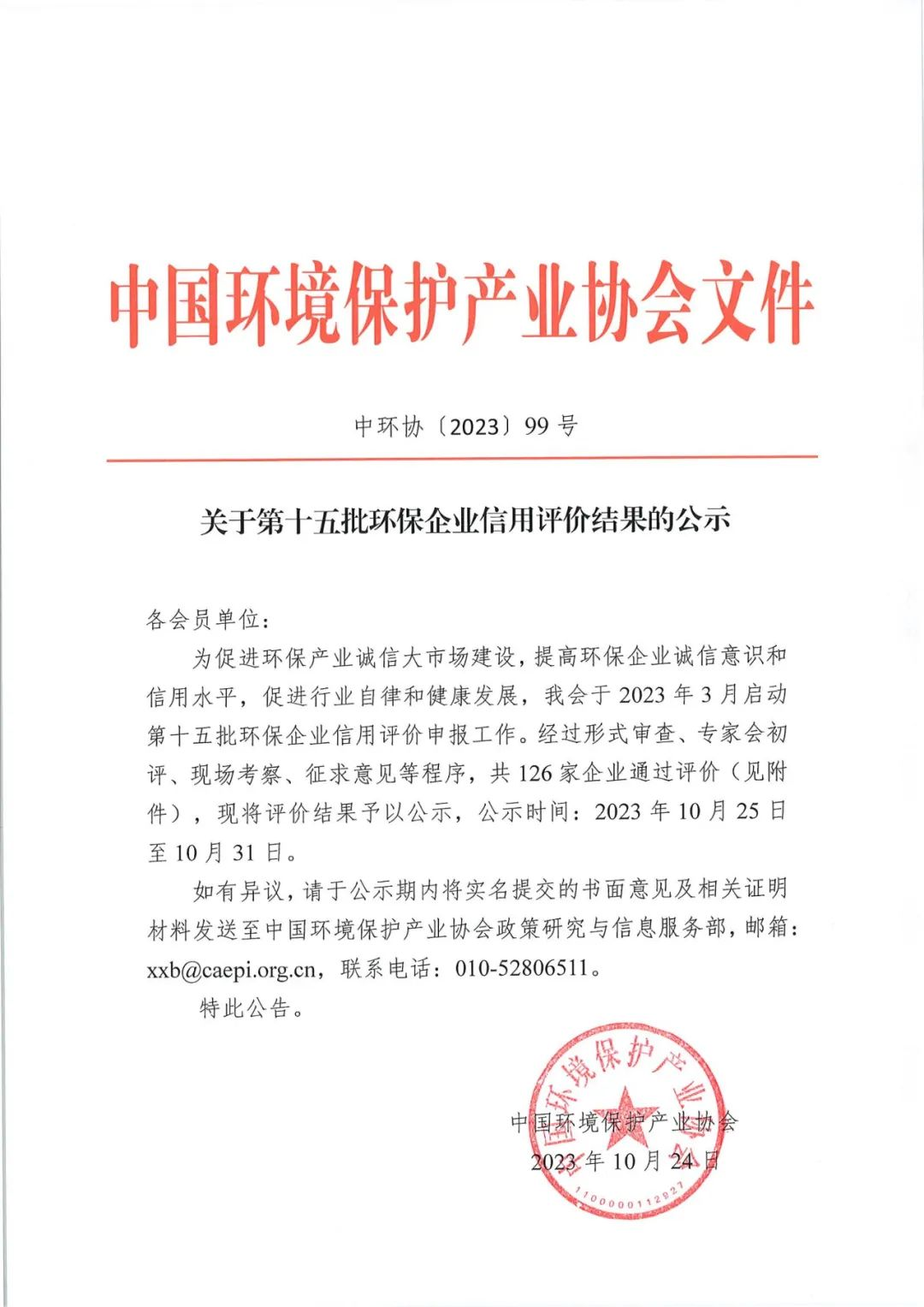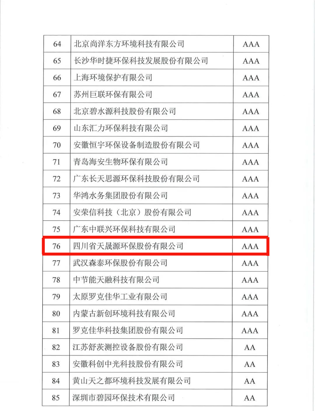 10月31日,在2023年中環(huán)協(xié)第十五輪環(huán)保企業(yè)信用評價中,四川省天晟源環(huán)保股份有限公司(簡稱:“天晟源環(huán)保”)再次榮獲中國環(huán)保產(chǎn)業(yè)協(xié)會授予的“AAA級環(huán)保企業(yè)信用評價”榮譽。這是天晟源環(huán)保繼2020年首次獲得該項榮譽并期滿后,再次以優(yōu)秀的表現(xiàn)和扎實的環(huán)保業(yè)績獲得此項頂級評價。