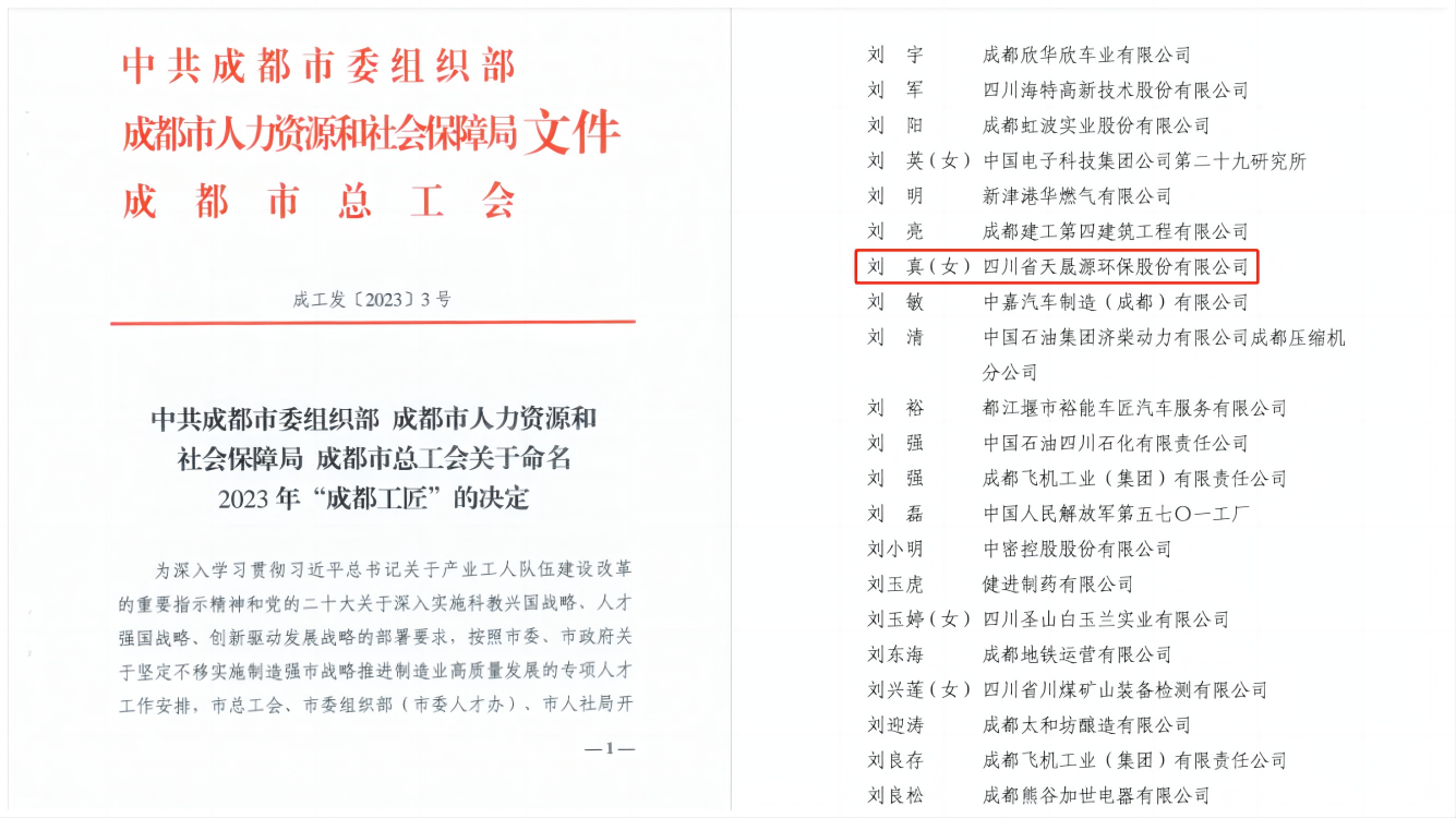 2023年5月5日,“成都工匠命名大會”在天府國際會議中心舉行,四川省天晟源環(huán)保股份有限公司(簡稱“天晟源環(huán)保”)劉真同志在大會上被授予“成都工匠”榮譽稱號,天晟源環(huán)保工會主席、副總經(jīng)理李美玲代表企業(yè)參加大會。