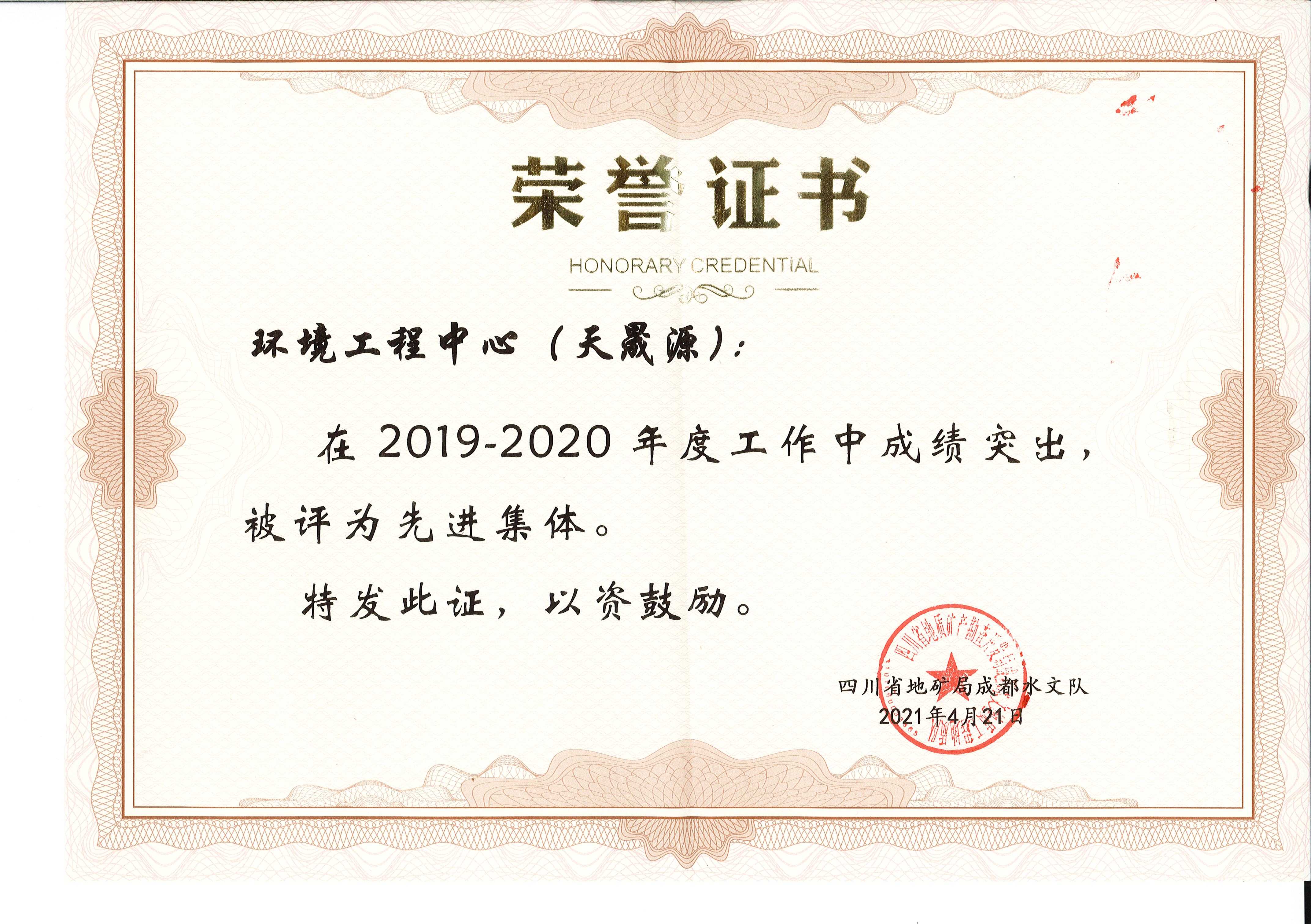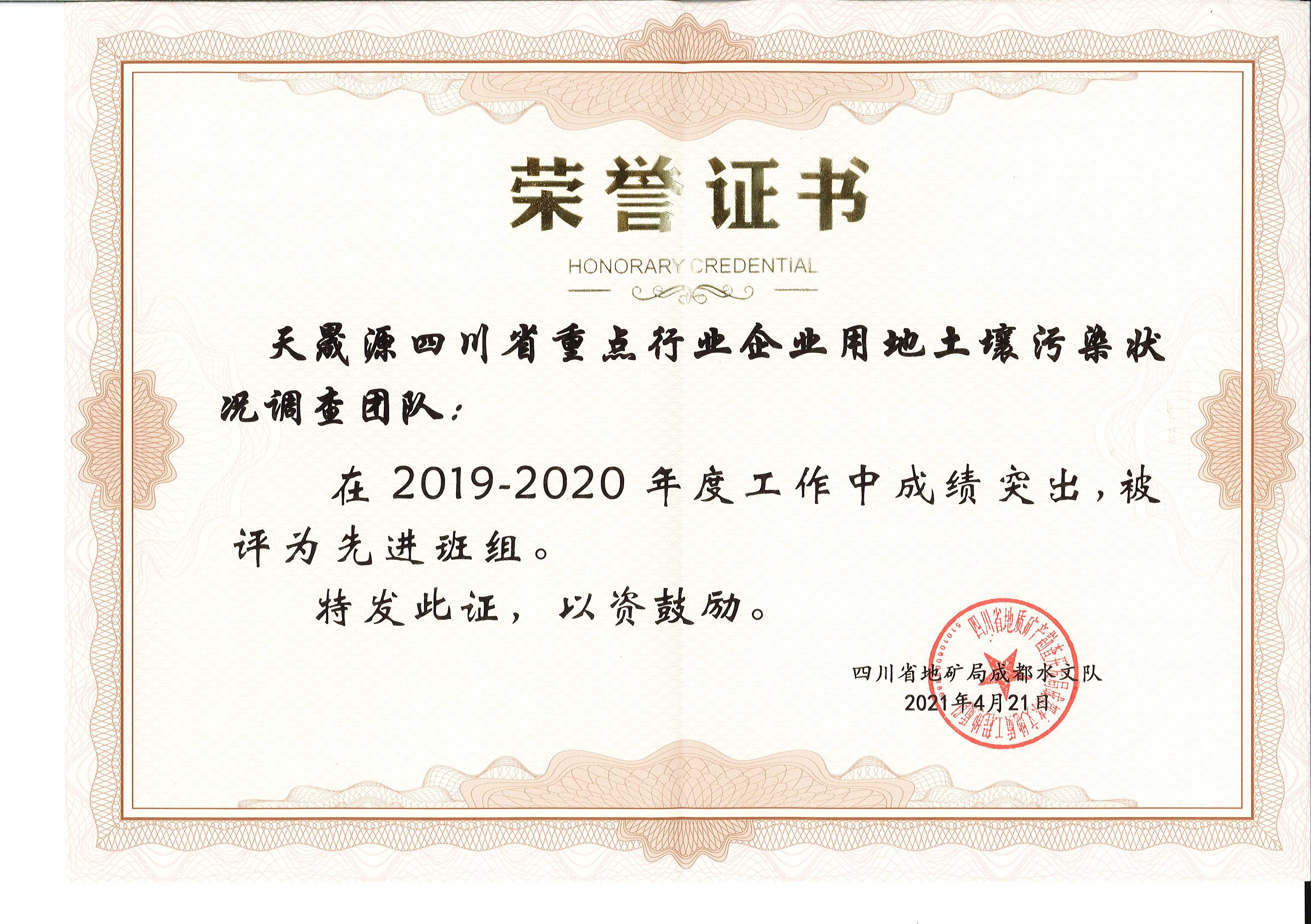 ?2021年4月25日,四川省地礦局成都水文隊印發了《關于表彰2019~2020年度先進集體(班組)和先進生產(工作)者暨最美川勘人的決定》(川地礦成水發〔2021〕16號),文件對成都水文隊2019-2020年度涌現出的先進集體(班組)和個人進行了表彰,四川省地質工程勘察院環境工程中心(天晟源)喜獲“先進集體”榮譽,天晟源環保四川省重點行業企業用地土壤污染狀況調查團隊斬獲了“先進班組”稱號!