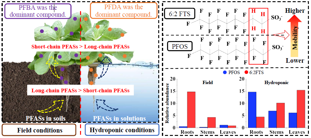 垃圾填埋場作為PFASs的重要來源之一,對周邊環境介質(土壤、地下水、地表水及底泥等)和植物均會造成影響。本文調查研究了某垃圾填埋場周邊甘藍根、莖及葉片中15種PFASs的富集水平,并通過室內水培試驗,研究了PFASs在甘藍根、莖、葉片中的遷移及富集規律。在野外和實驗室水培條件下的結果均表明,PFASs在根、莖、葉中的濃度依次降低,而短鏈PFASs更容易從根部遷移到葉片,就飲食攝入甘藍而言,短鏈PFASs及某些新型替代物對人體的潛在健康風險要高于傳統PFASs。