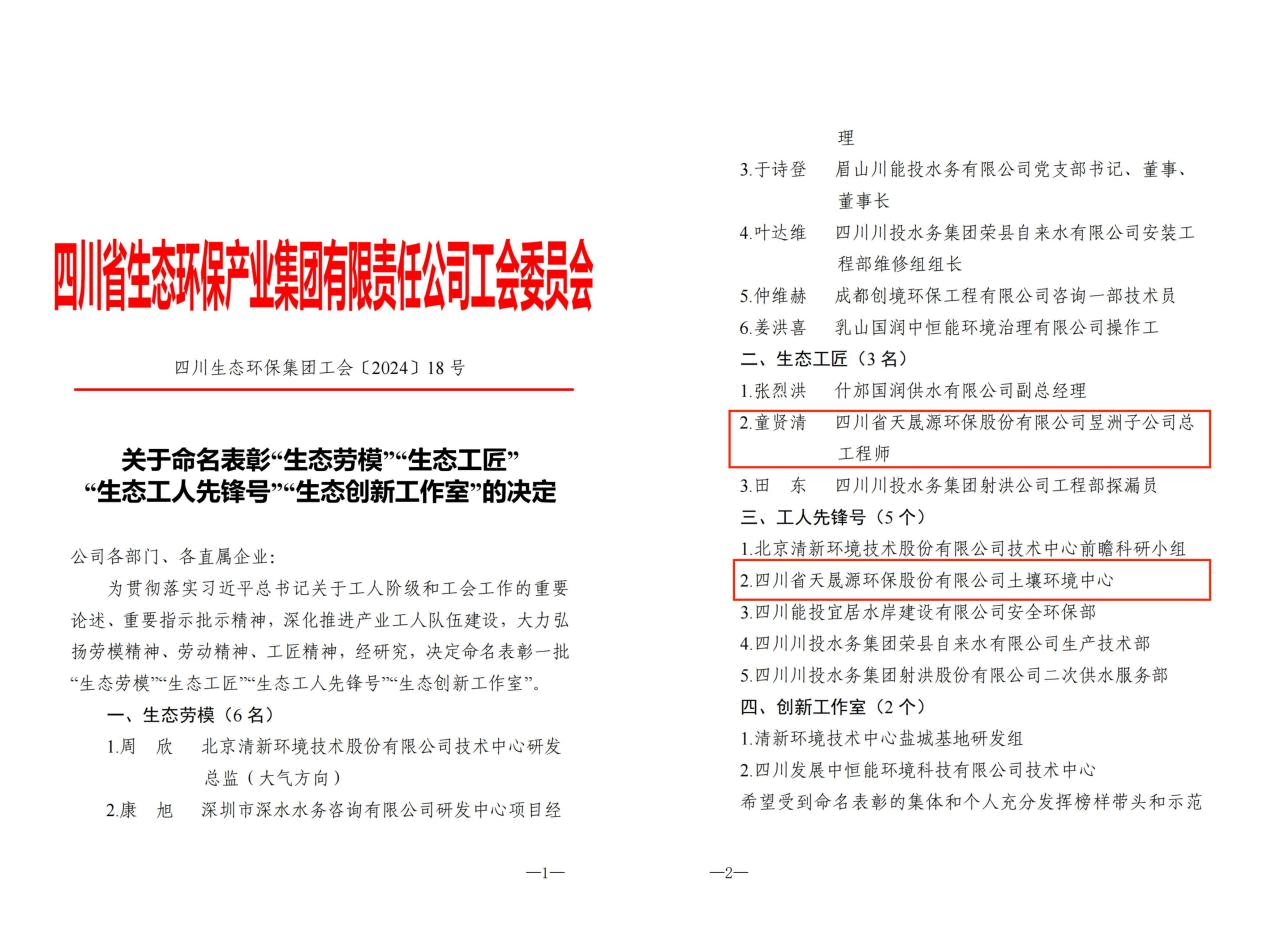 近日,四川省生態環保產業集團有限責任公司工會委員會發布《關于命名表彰“生態勞模”“生態工匠”“生態工人先鋒號”“生態創新工作室”的決定》(四川生態環保集團工會〔2024〕18號),四川省天晟源環保股份有限公司(簡稱:天晟源環保)土壤環境中心榮獲“工人先鋒號”榮譽稱號,天晟源環保昱洲子公司總工程師童賢清榮獲“生態工匠”榮譽稱號。