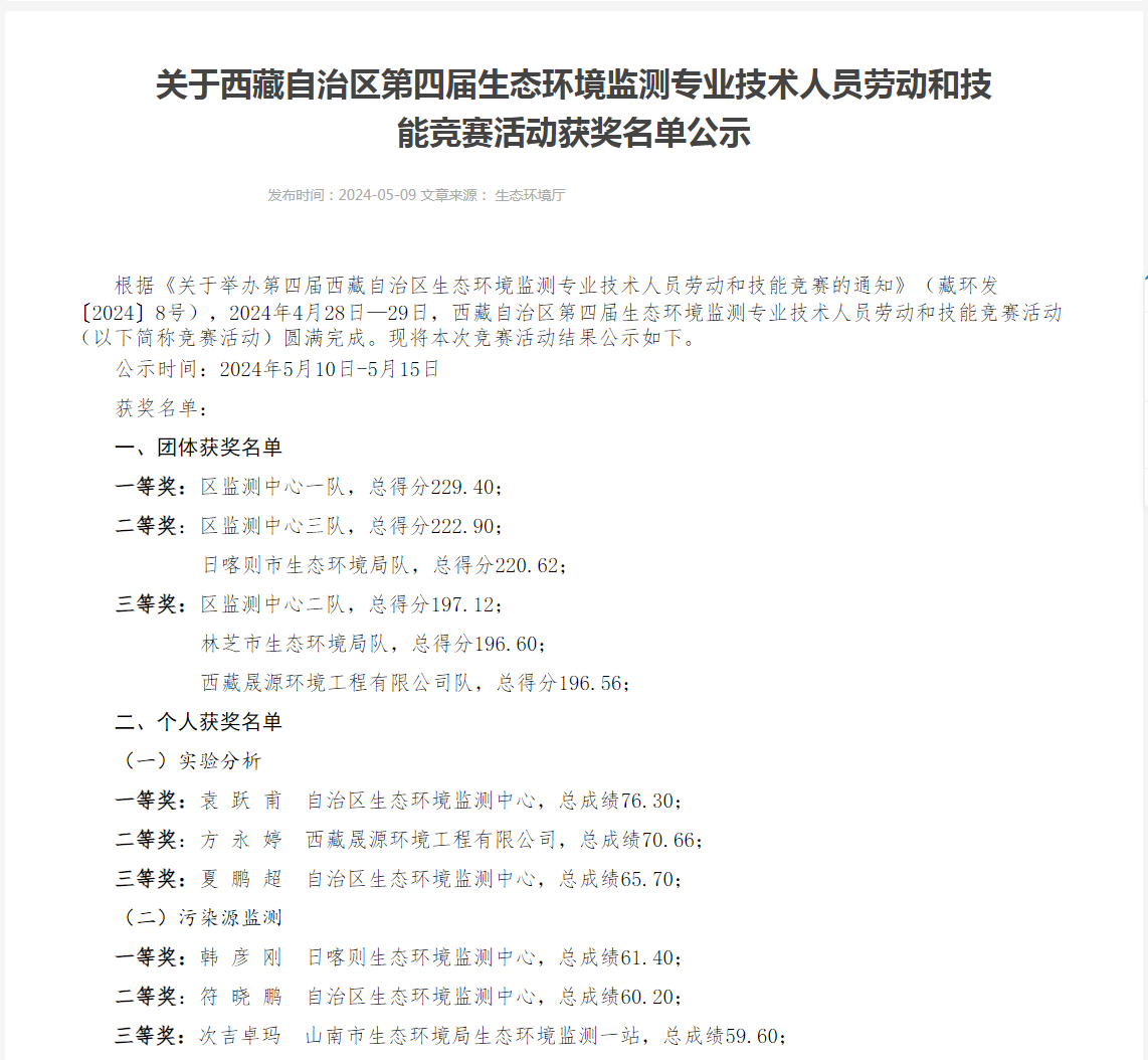 2024年5月9日,西藏自治區(qū)生態(tài)環(huán)境廳公布2024第四屆西藏自治區(qū)生態(tài)環(huán)境監(jiān)測專業(yè)技術(shù)人員勞動(dòng)和技能競賽(簡稱“第四屆大比武”)獲獎(jiǎng)名單,四川省天晟源環(huán)保股份有限公司子公司西藏晟源環(huán)境工程有限公司(以下簡稱“西藏晟源”)榮獲團(tuán)體獎(jiǎng)三等獎(jiǎng),在第三方社會監(jiān)測機(jī)構(gòu)中名列第一,同時(shí)方永婷斬獲實(shí)驗(yàn)分析組個(gè)人獎(jiǎng)項(xiàng)二等獎(jiǎng)。繼第三屆大比武獲獎(jiǎng)后,西藏晟源在第四屆大比武中再創(chuàng)佳績,展現(xiàn)了西藏晟源在西藏自治區(qū)區(qū)內(nèi)環(huán)境監(jiān)測領(lǐng)域的過硬實(shí)力。
